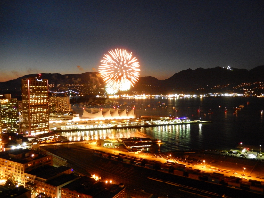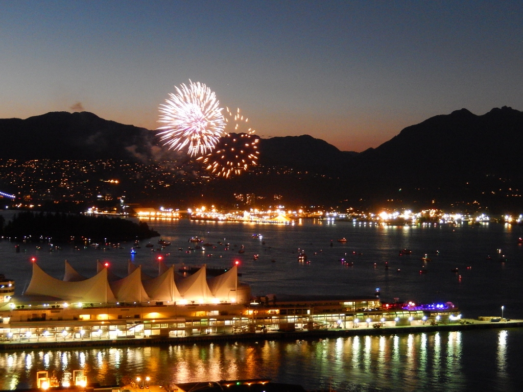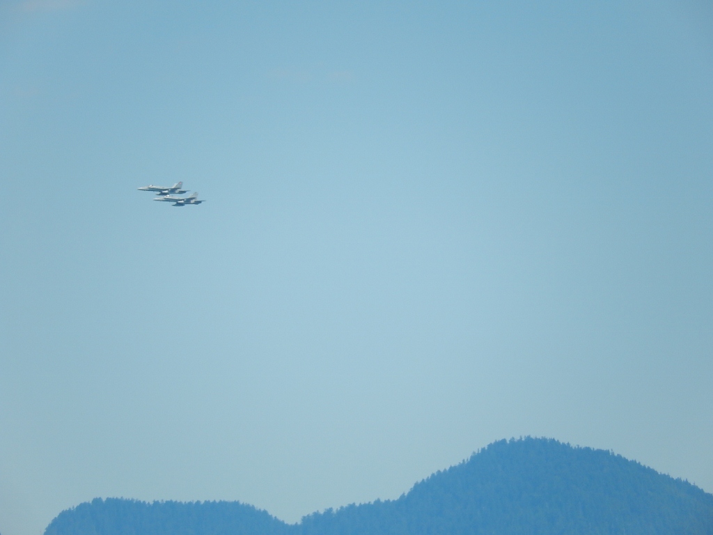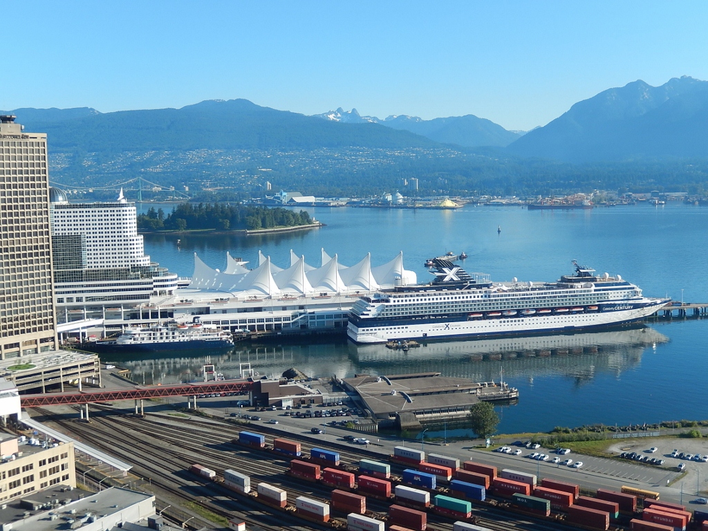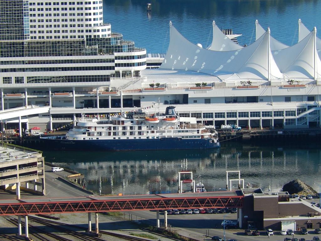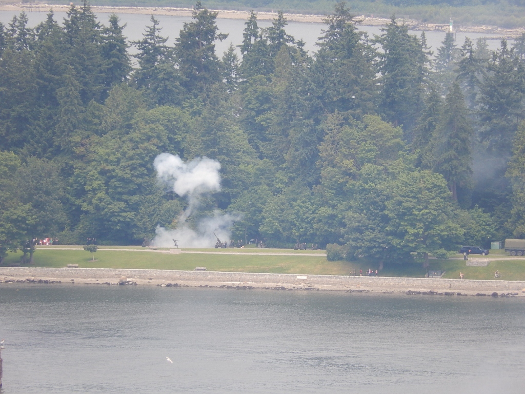 Canada Day in Vancouver started with the arrival of two Canadian Royal Air Force military jets flying (very) low over Burrard Inlet at noon. This was immediately followed by a – we are still unsure – if it was a 21 or 24 artillery gun salute from guns set up along the road over at Stanley Park near the 9 o’clock cannon. Also in port that day, along with the usual Celebrity ship, was the Caledonia Sky, a ship we’ve never seen here and which specializes in Arctic and Antarctica cruises. It is a very tiny ship (you can see the comparison below) and looking at its website, very very expensive.