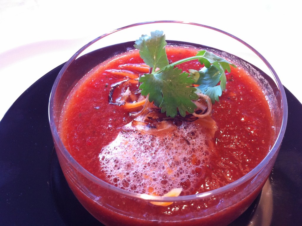 On Saturday we had WestJet Sue and Kevin over for dinner and made this outstanding ‘Cambodian’ gazpacho. I remain a little confused as to why it got itself a Cambodian title, but I suspect it is the result of the addition of rice wine vinegar, pickled carrots; deep-fried shallots and one boat load of chillies. G even made tomato foam to finish it with. Highly, highly recommended.