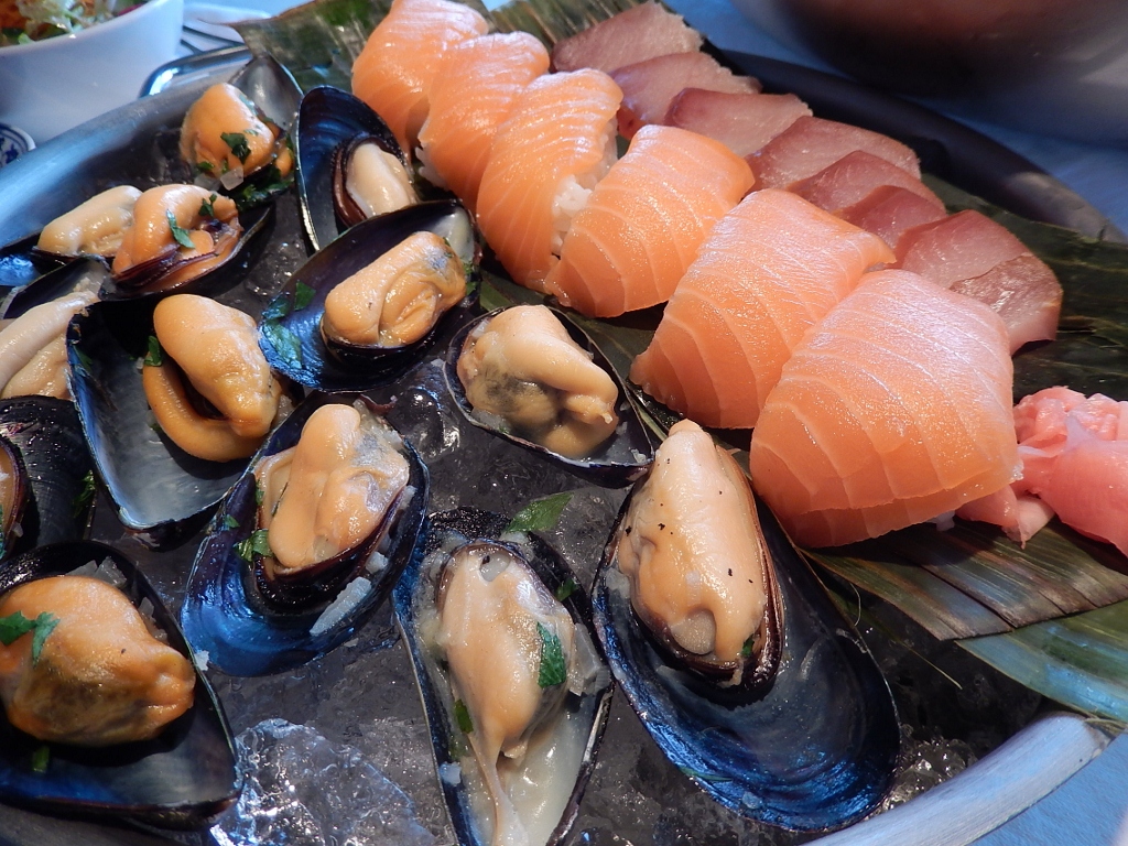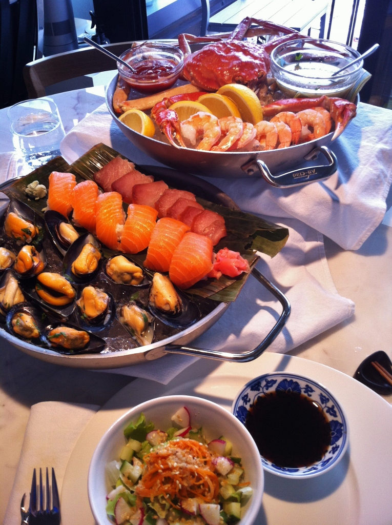 For a Sunday dinner, we decided rather last minute to make a cold seafood tower. We’ve had these in several establishments and hotels (most notably at the Pacific Rim during a stay [see here]) and having prepped it certainly can understand the cost involved when ordering such a smorgasbord: it’s a crapload of work! However, the perseverance is worth it. For our version we prepared a snowcrab; salmon sushi; pacific mussels that G did up in what was the best broth ever (white wine, shallots, butter, garlic, parsley and cilantro); a small japanese-style iceberg lettuce salad with a daikon radish soy dressing I mixed up; cold smoked tuna (which we bought!) and Ecuadorean shrimp. Fabulous, fabulous!
