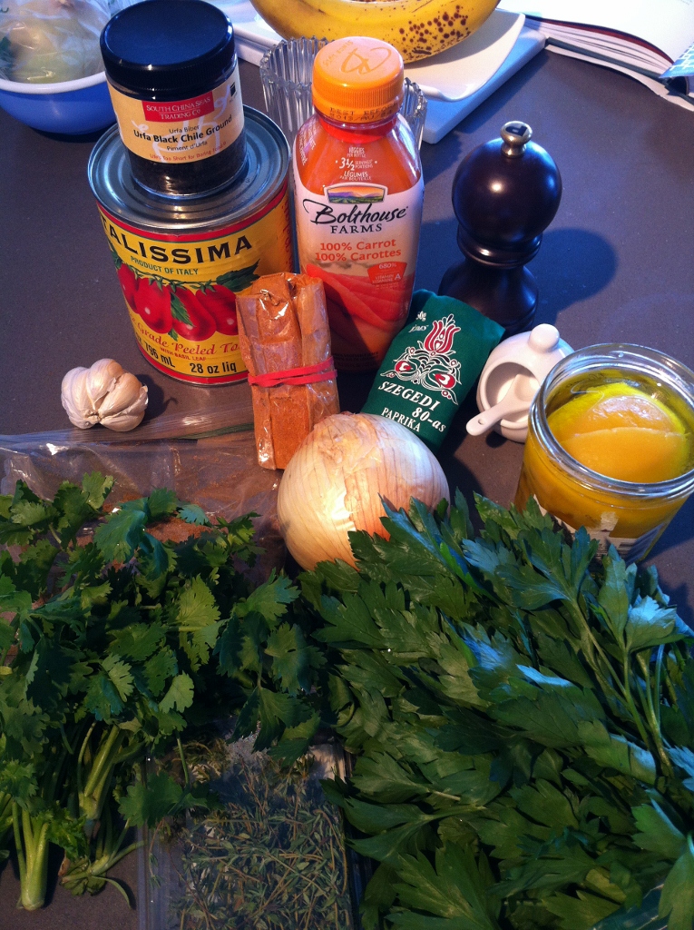 8) gathering the ingredients – thyme, cilantro, parsley, onion, cumin, preserved lemon, sweet paprika, tomatoes, garlic, urfa, water and cayenne