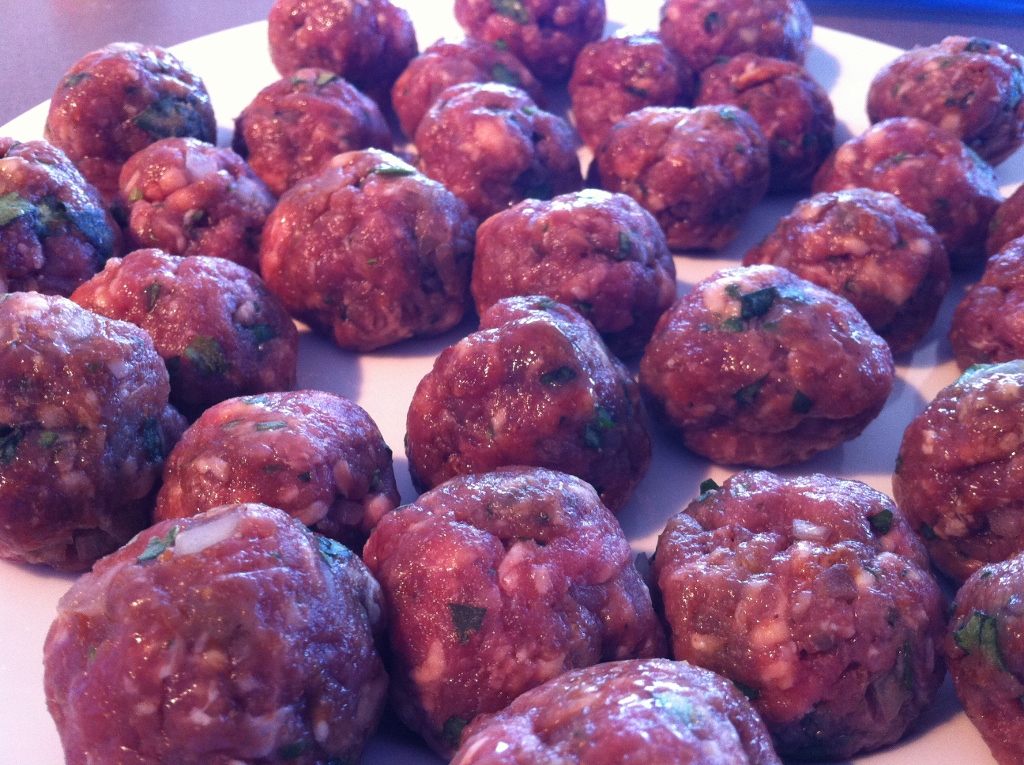 9) prepare the meatballs – they ar about an inch in size – and have a ton of spices – cumin, paprika, cayenne, white pepper, salt, cilantro