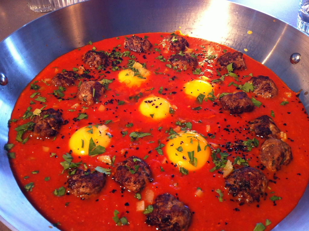 I continue to be enamoured of Mourad’s “New Moroccan” cuisine cookbook and made his version of kefta with custardy egg yolks last week. Kefta is a mixture of ground lamb and beef that is usually served in one of three ways: rolled into balls and served in a sauce (as I did below); stuffed into peppers and baked; or served as cigars on metal skewers on the street. The sauce is very good probably thanks to the addition of carrot juice (sort of like in a Bolognese), preserved lemon (which I made awhile back) and the sprinkling of urfa chile power when you serve it. Urfa is a chile from a very specific place in Turkey and has a rich, earthy, raisin-like taste with a hint of heat. I suspect it would go very good in desserts as well.