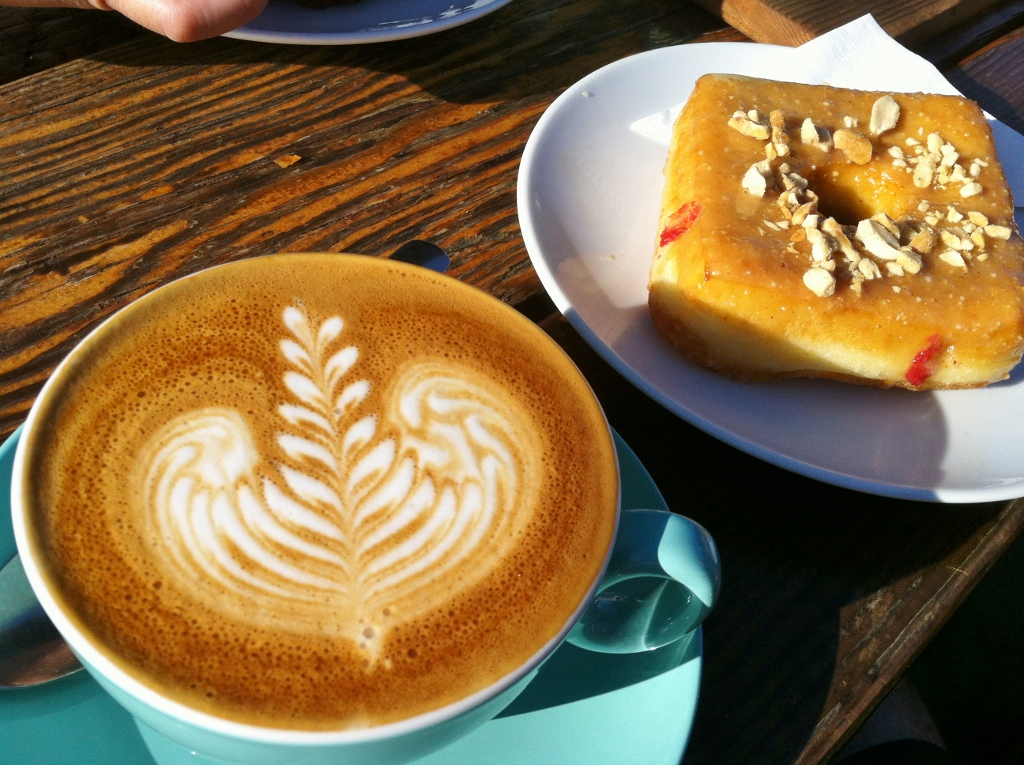 G opted for an earl grey tea and a maple bacon donut; I opted for a cafe latte (that took far too long to construct I’ll add again) and a peanut butter and (disappointingly) raspberry filled donut. I abhor raspberry anything and wanted strawberry but hey, such is life. Interestingly, and quietly happily I’ll admit, Lucky’s fills their donuts not as tradition has it in the middle, but rather pipes the raspberry in each of the corners. Prompts for that indeed. And the verdict? … coffee is fabulous and worth the trip in itself. Maple bacon donut is superb with a delicious bacon-forward flavour that puts the Voodoo Donuts (in Portland – see here) to shame. PB&J is … well, fine. And insomuch as fine is never really fine probably tells you everything you need to know.
