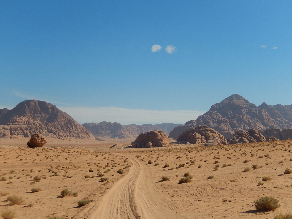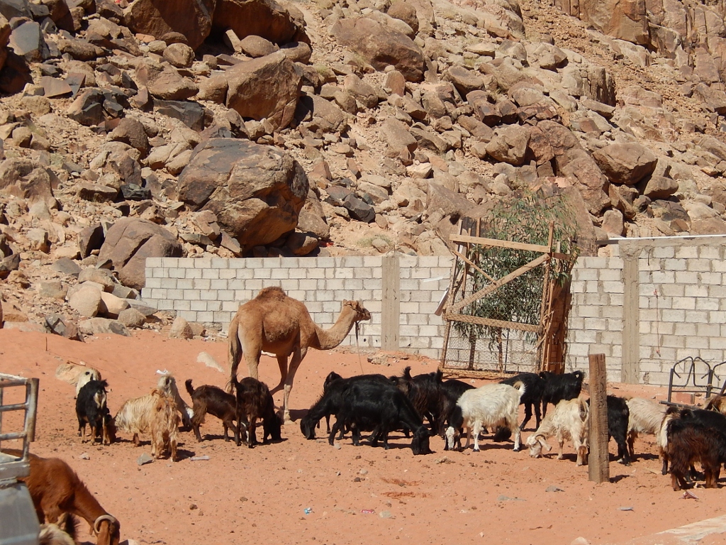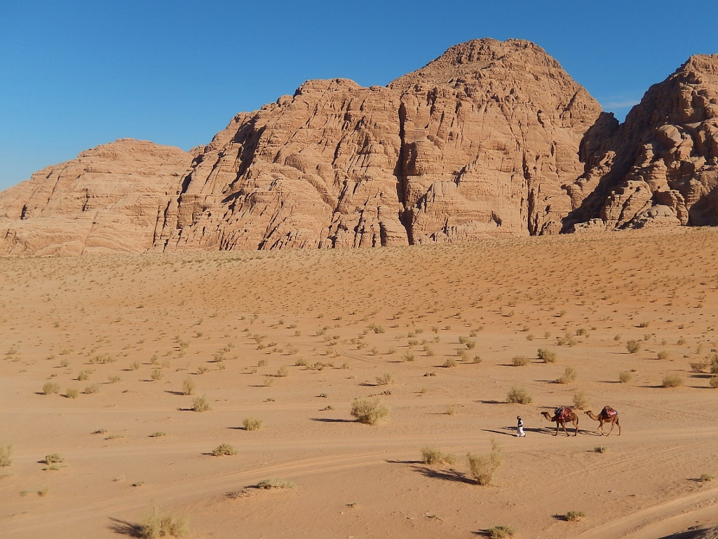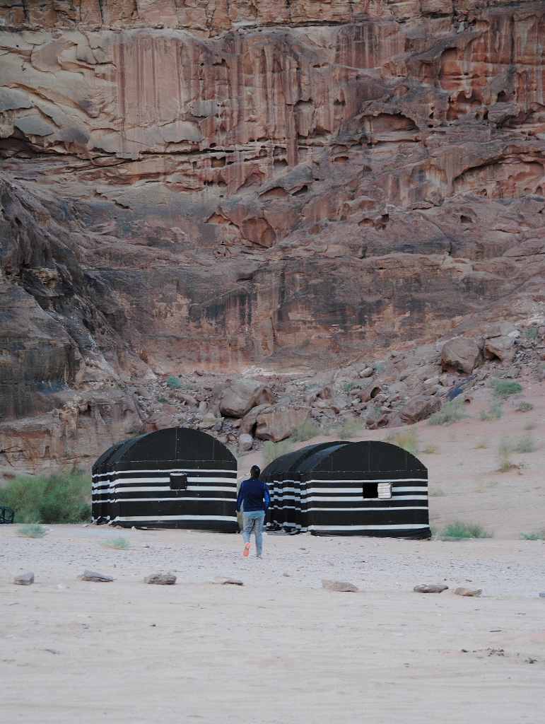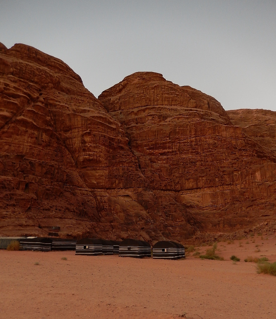 Wadi Rum is a vast desert filled with limestone and granite mountains that are dotted between endless expanses of sand and sand dunes. It has a surreal feel to it and stark beauty that is beguiling. During the day it is a furnace with stiff winds that have etched and shaped everything in its path, the mountains included; at night it is a refrigerator that necessitated several camel-hair blankets on our wee cots inside the Bedouin camp we overnighted at. Our driver drove us out the Wadi Rum Village where we met our Bedouin guide, Mohammed, who then whisked us – literally – off the road and into another world. It was a fascinating experience that lived up to everything I had hoped for.