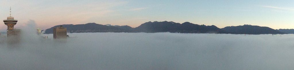 In the previous post I posted a panoramic photo of the view from our condo. I wanted to contrast that photo with the one above – taken this morning – a view from our condo with the endless fog we’ve been experiencing. It’s lovely living above the fog and the sound of the fog horns playing out on Coal Harbour, while mournful in a way, is also very comforting.