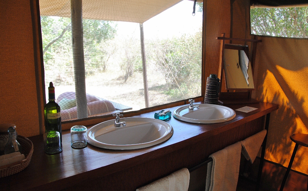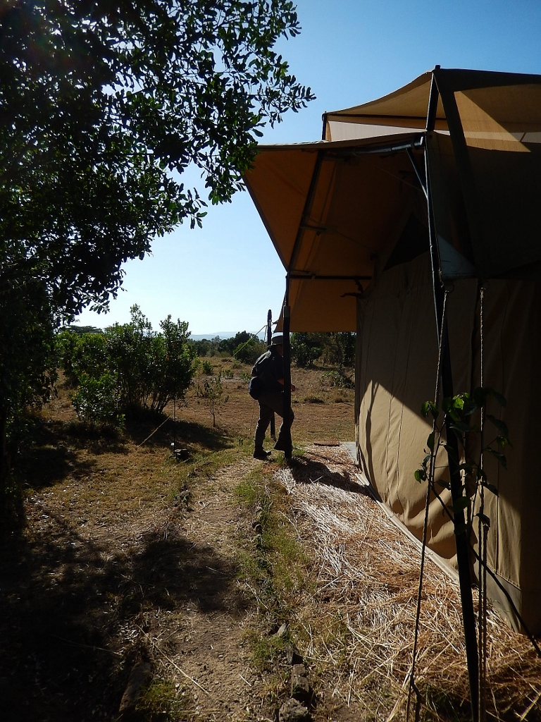 We picked our way through the scrub and bush, over and down several escarpments and arrived on a plain to enjoy lunch under an acacia tree. By early afternoon we arrived at camp and were met by Chris and his team, briefed on several camp ‘rules’ – which included no walking to/from the dining tent without an armed guard from dusk to dawn; no wandering past the cut grass line in front of our tent; showering procedures – water is heated and then hauled by hand to fill a 40 litre canvas bag that fed the shower in our tent; wear sunscreen and repellant; spray your tent with repellant just before leaving for dinner – and how each day of our 4 day stay would evolve.