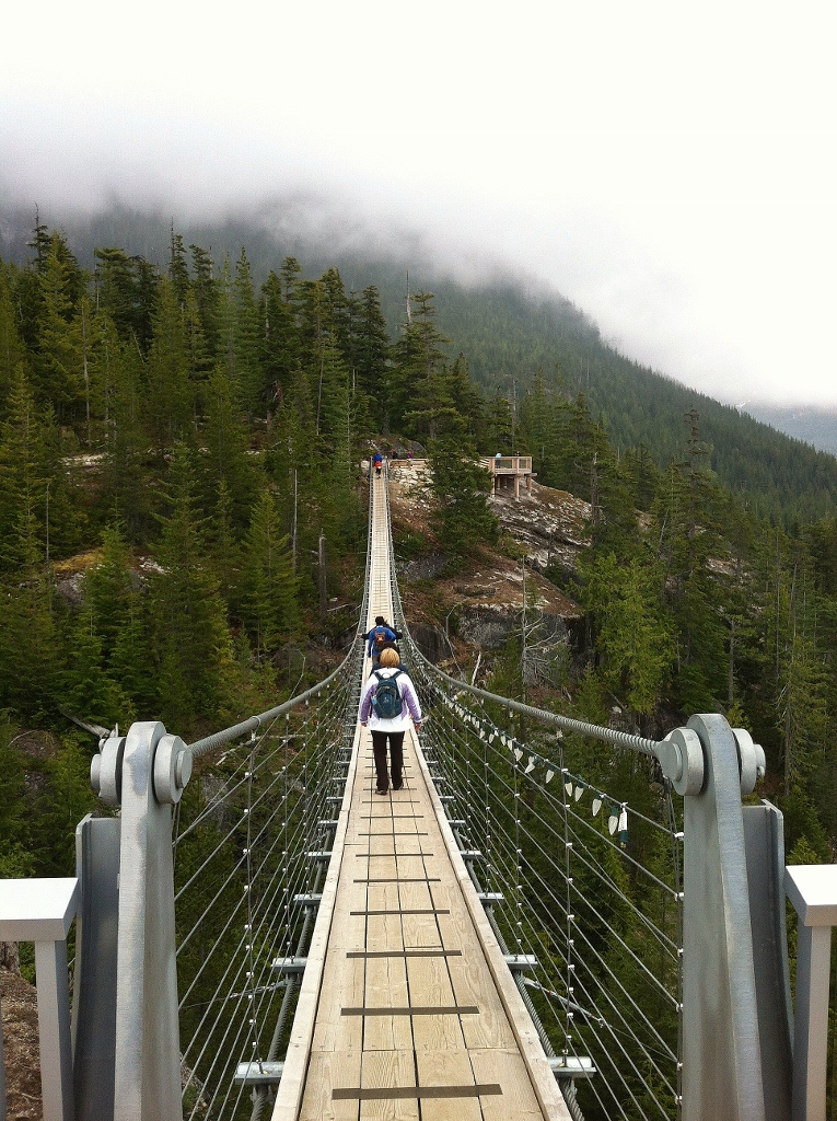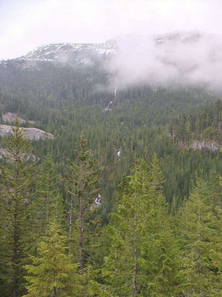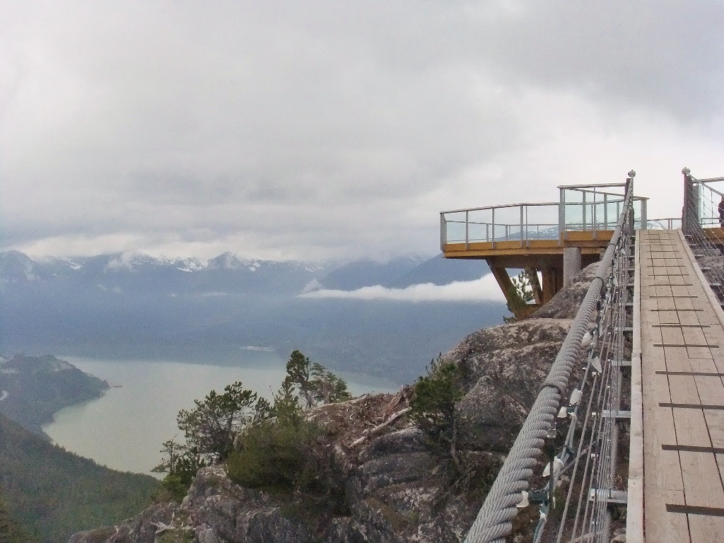 Saturday morning found us at Shannon Falls bright and squirrelly for a walk through before arriving at the Sea to Sky Gondola at 8:30AM. It is the Victoria Day long weekend in British Columbia this weekend and although we were expecting crowds, the parking lot was empty save for 8 or so vehicles. I suspect the threat of rain keep many folks away. Anyhow, by 9:10 we had tickets in hand and were aboard our gondola car heading up the mountain. The trip takes about 10 minutes and deposits you at the Summit Lodge some 885m above sea level. At the summit there is a small rabbit warren of trails – the longest being a 1.6km loop; a suspension bridge with views (when not cloudy!) of mountains Sky Pilot and Co-Pilot; some lovely viewing points; and access to the backcountry trails.
