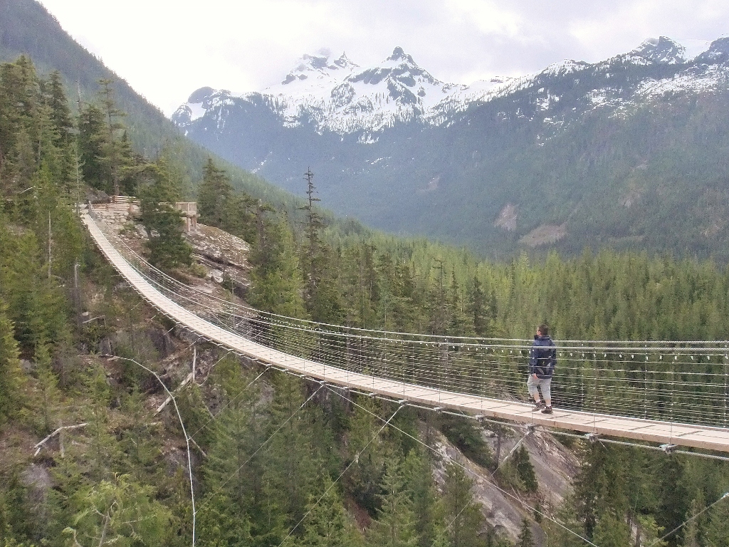 33) G takes one final stroll on the suspension bridge before heading down (Mountains Sky Pilot and Co-Pilot in background)
