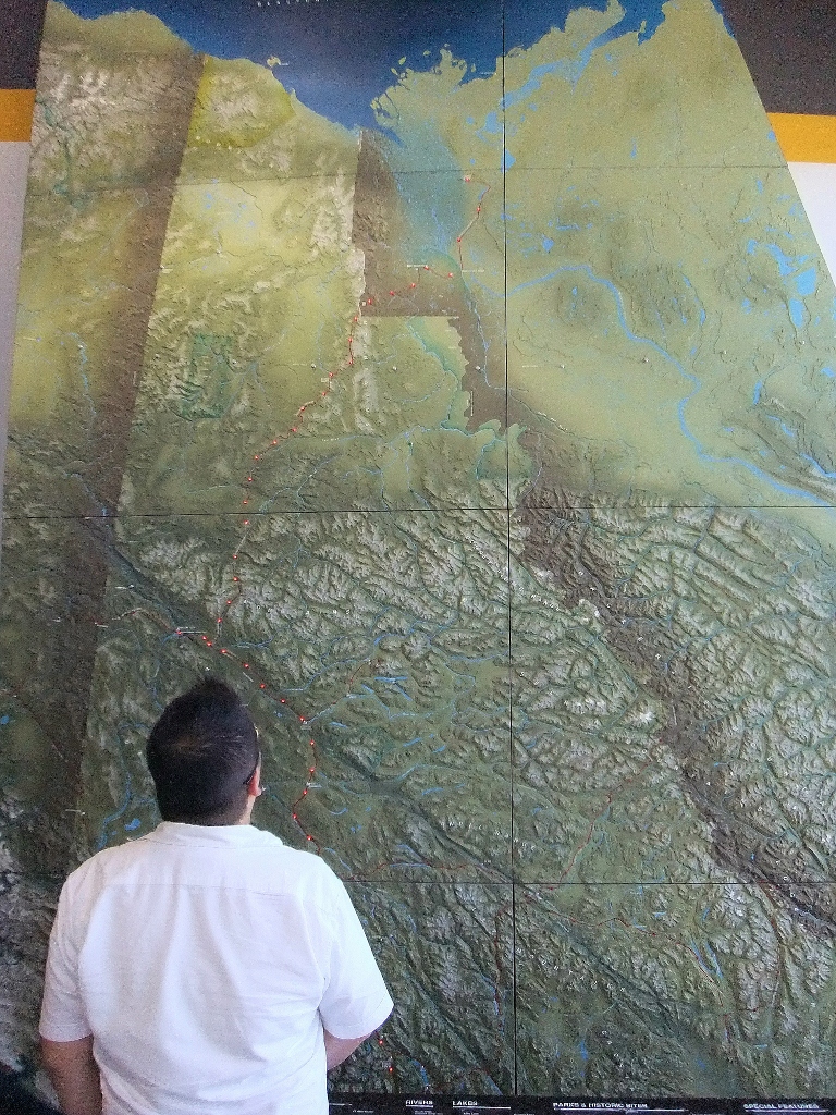 2) G takes a look at that long line of red lights which represent the road we’re driving north Inuvik