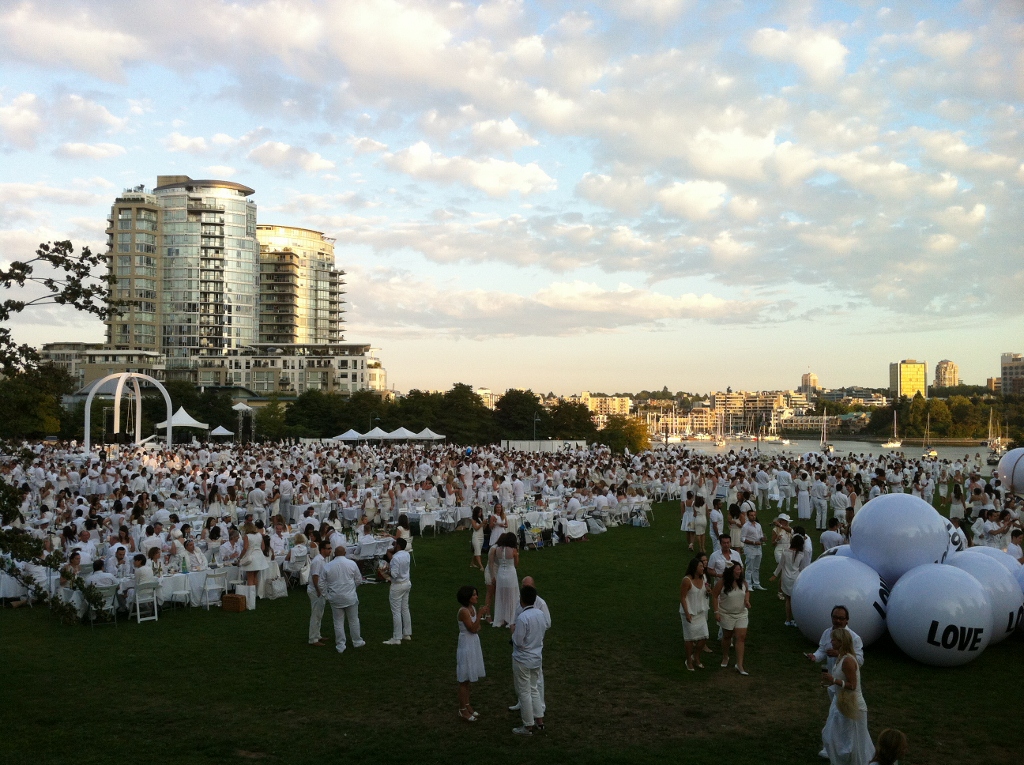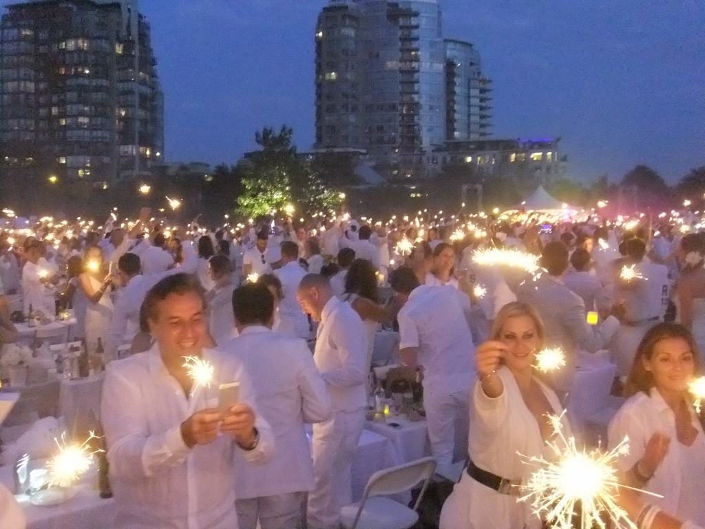 As the evening wore on and the bottle of wines drained, the party got into full swing. There was the usual lighting of sparklers before folks, us included, rushed the wee stage and started dancing. The Diner en blanc promoters, the well-known boutique marketing firm, The Social Concierge, put on another fabulous evening that included vogue-like dancers, opera singers from the Vancouver Opera Company and even a neat large-white-ball art installation. The only hiccup as darkness set in was the lighting of many dozens of Japanese paper balloons which drifted so close to condo balconies at the park that Vancouver firefighters were called out. Oops!