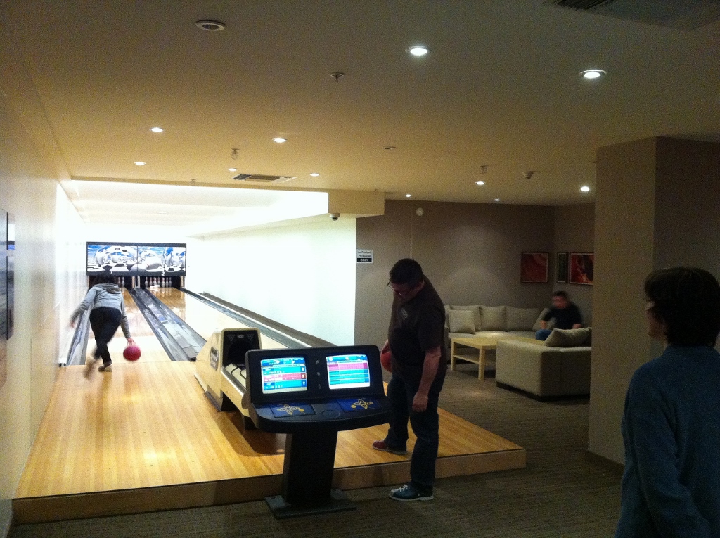 9) we hosted a New Year’s Eve party as well and went bowling (we’ve an alley in the condo, go figure); here Blee is up while Kevin checks the scores, G gets up to bowl and Barb watches on