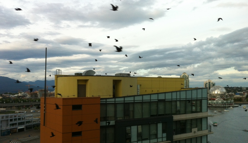 If you live in Vancouver, you will have at some point see the murder of crows that fly east towards Burnaby each night at sunset. During July the 6,000 odd crows’ path took them right past the east side of our condo … as you can see in the picture below. You can read more about the crows in this National Post article. Creepily Hitchcockian isn’t it.